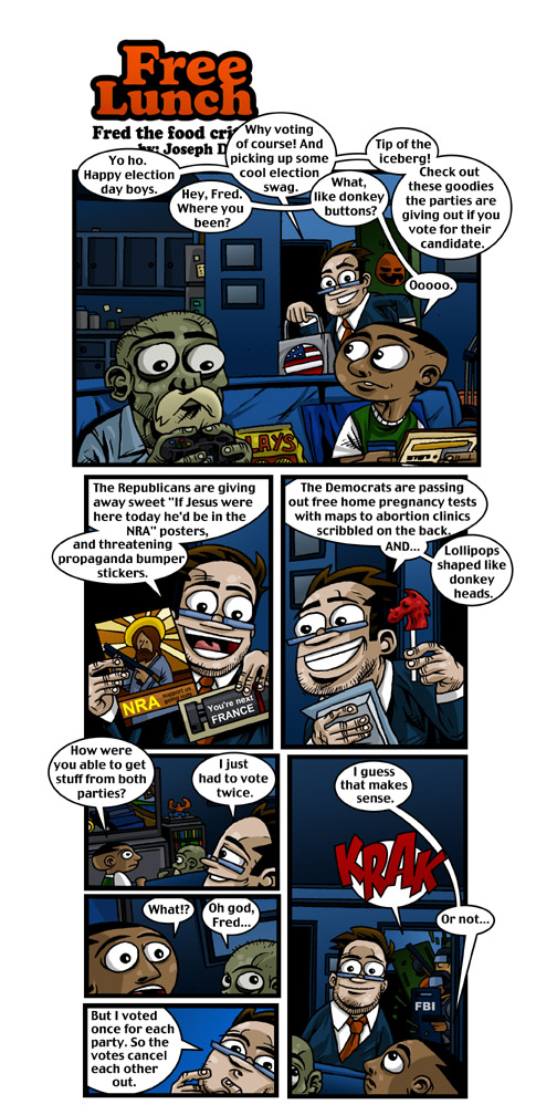 Meet Fred the Food critic, star of "Free Lunch". He?s a filthy slob with a bottomless stomach and an unkind word for everyone. Visit Fred each week as he and his cohorts get into mix up after mix up of food related fun.