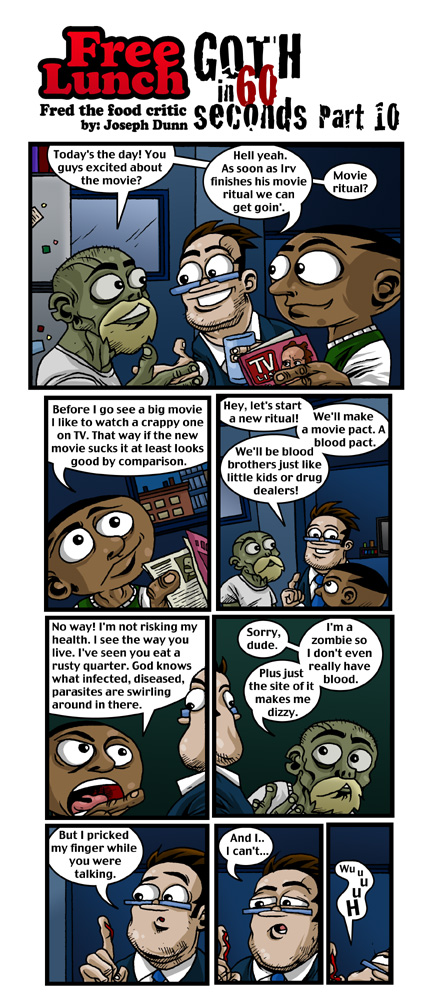 Tank – This zombie with a mysterious past first met the gang during a world wired zombie outbreak. Tank is a zombie not ruled by his urges. His mother was bitten by a zombie while he was in the womb. He was born with all their power, but still humanity to control himself. Just like in the movie Blade. Ironically he’d never seen Blade before meeting Fred and Irv. He ended up really liking it.