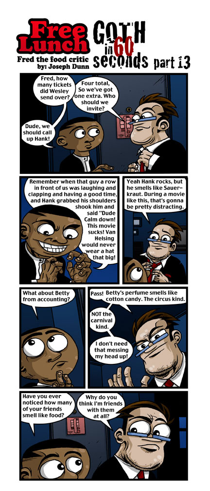 Meet Fred the Food critic, star of "Free Lunch". He?s a filthy slob with a bottomless stomach and an unkind word for everyone. Visit Fred each week as he and his cohorts get into mix up after mix up of food related fun.