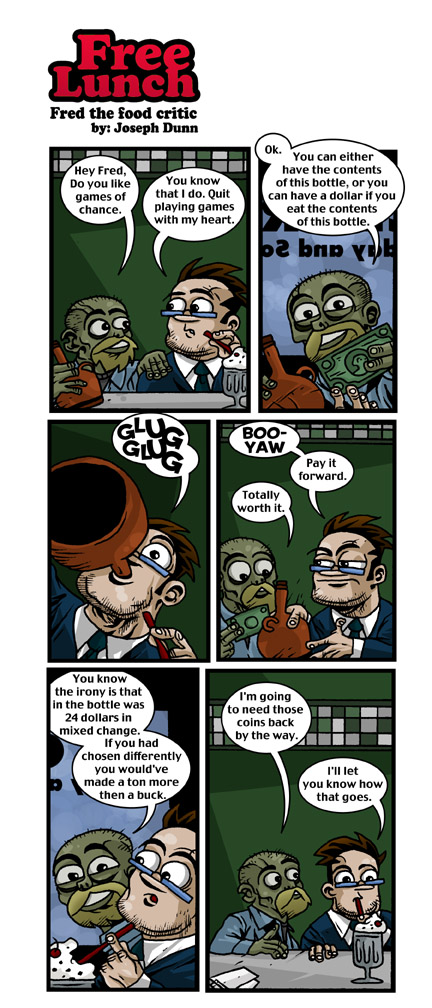 Meet Fred the Food critic, star of "Free Lunch". He?s a filthy slob with a bottomless stomach and an unkind word for everyone. Visit Fred each week as he and his cohorts get into mix up after mix up of food related fun.