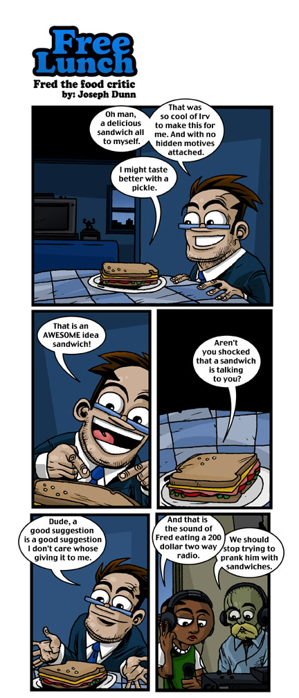 Meet Fred the Food critic, star of "Free Lunch". He?s a filthy slob with a bottomless stomach and an unkind word for everyone. Visit Fred each week as he and his cohorts get into mix up after mix up of food related fun.