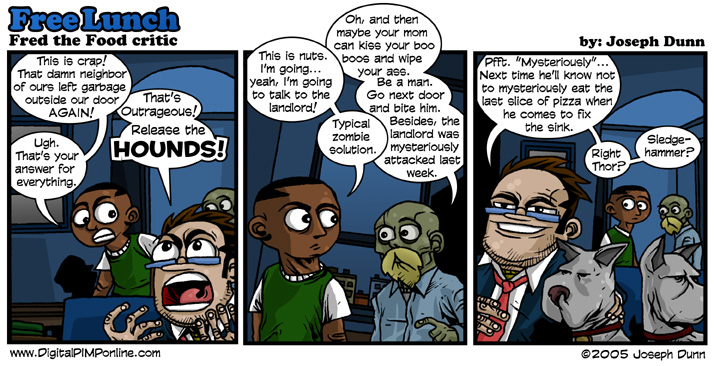 Meet Fred the Food critic, star of "Free Lunch". He?s a filthy slob with a bottomless stomach and an unkind word for everyone. Visit Fred each week as he and his cohorts get into mix up after mix up of food related fun.