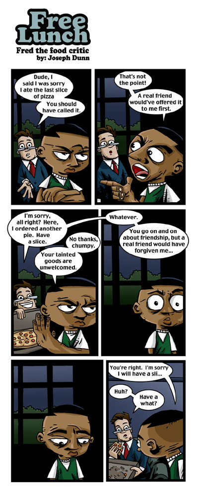 Meet Fred the Food critic, star of "Free Lunch". He?s a filthy slob with a bottomless stomach and an unkind word for everyone. Visit Fred each week as he and his cohorts get into mix up after mix up of food related fun.