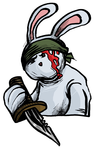 This is the first real blood in a strip that promises to bring more blood. The first blood in a strip where a cat has been launched through a helicopter window and a turtle has had a cannonball dropped on his head. There was plenty of room for blood there but the fact that it’s colored for the first time here means that I wanted you to notice it. I wanted it to be clear that the first blood between the two main characters marks a point that the strip is jumping to a new level. It’s about to get dangerous. Also I got to draw RAMBO BUNNY!